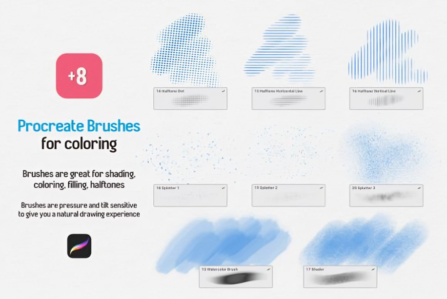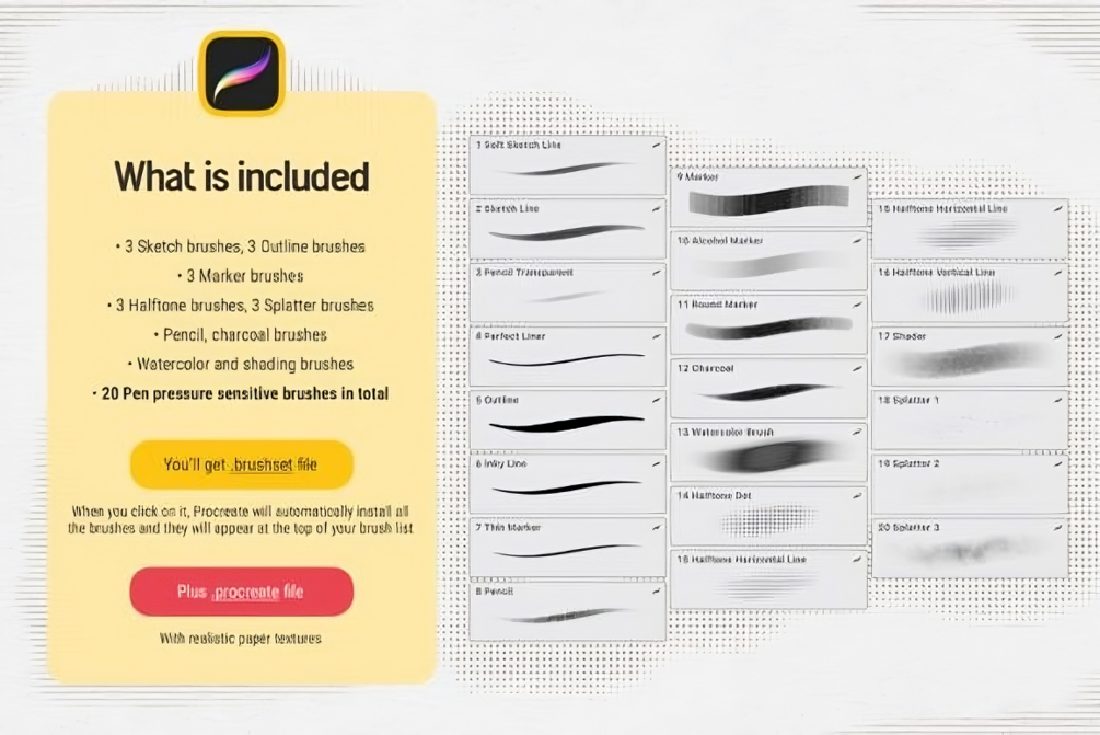 Each brush in this set is carefully designed for specific tasks like sketching, line work, halftones, splatters, and even watercolor shading — making it perfect for everything from rough drafts to polished illustrations.
