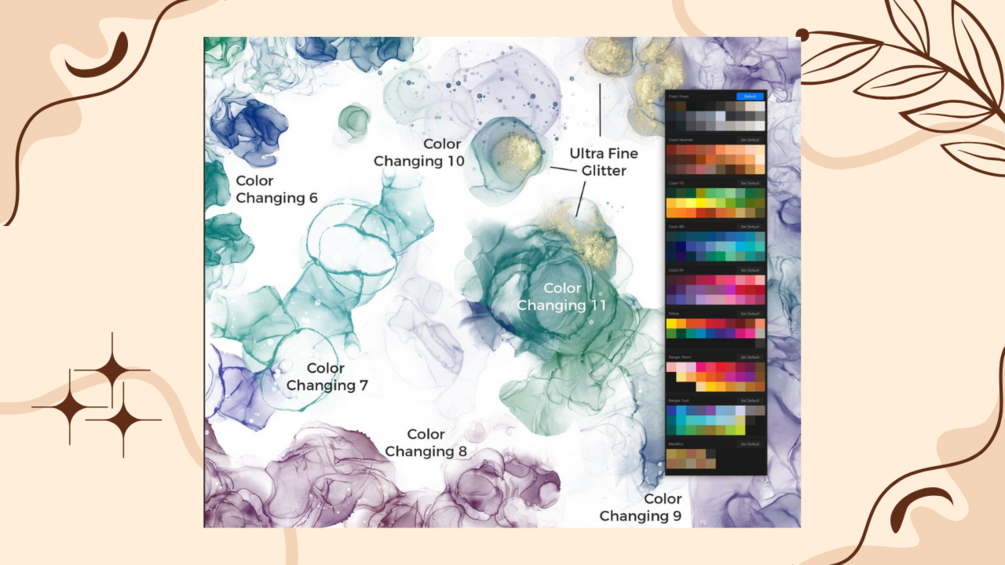 - 8 additional color palettes inspired by popular alcohol ink brands for authentic, vibrant hues